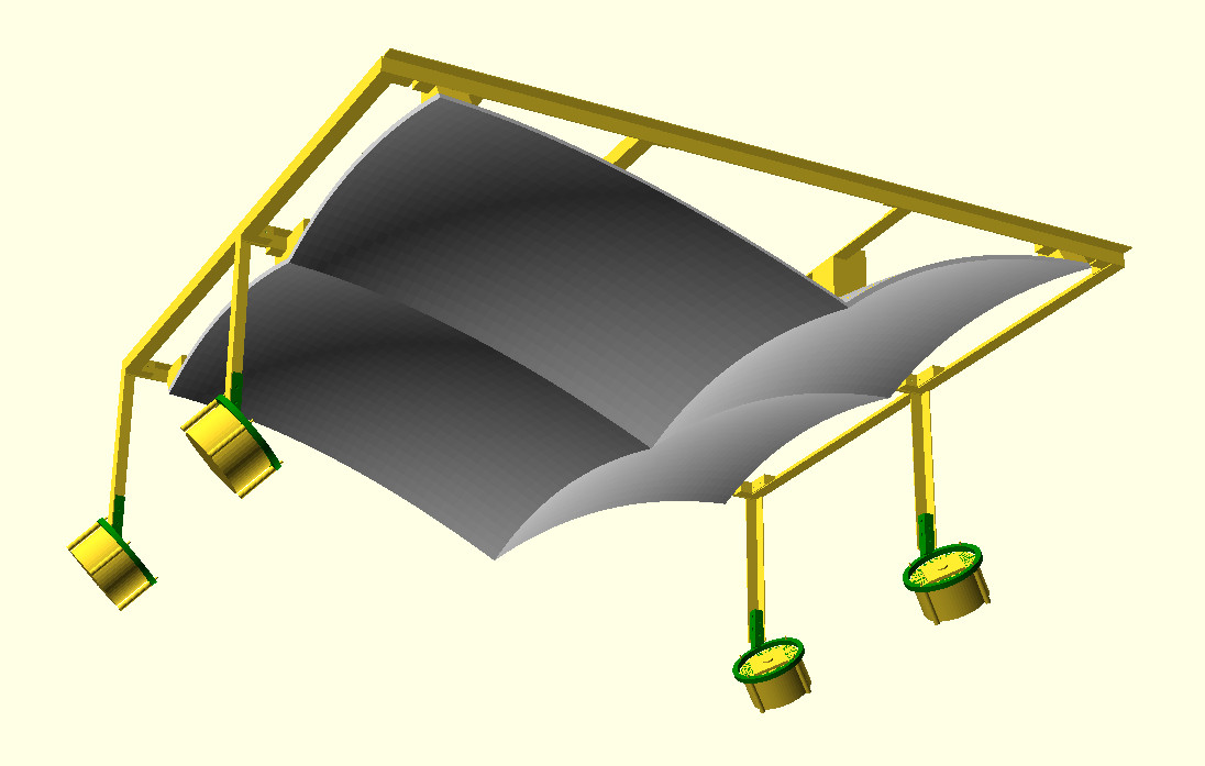 I opted to use parabolic mirrors to make the light parallel. My aim was to have a core illuminated area of about 1m², which in turn meant that my total mirror surface had to equal this size. Using a single mirror would have required either a distant focal point or a high profile of the mirror itself. Both alternatives would interfere with the low profile of the ceiling light I was aiming for. As a solution I designed four mirrors that align seamlessly and have close, off-center focal points (Fig. 2a/b). Each mirror is split into multiple pieces that were printed on a 3D printer and later assembled using tongue and groove connections between the pieces. The mirror surface is created by a highly reflective film that is held in place with double-sided tape. For each mirror a LED is mounted in the mirror’s focal point using a 3D printed bracket and a low-cost CPU heatsink for cooling. Each LED puts out about 3.750 Lumen at 25 Watts resulting in about 15.000 Lumen at 100 Watts in total for the entire light, i.e., about 15% of the sun’s peak illuminance.