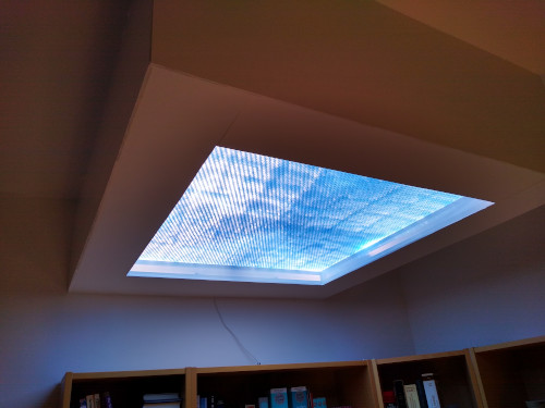 A small number of companies have specialized in reproducing the qualities of sunlight in artificial lighting. However, their products are quite expensive and often require an integration directly into the structure of the respective building. I wanted to design a ceiling light that mimics a skylight while retaining a relatively low profile (Fig. 1). To create an artificial sunlight one needs basically three things: a wide-spektrum light source, a way to make the light rays parallel, and a way to simulate Rayleigh scattering. As a light source I chose Nichia NFCWJ096B-V2 chip-on-board (COB) LEDs that have a color temperature of 6.500K and a color rendering index (CRI) of >90. The latter is a measure how well the color spectrum of the light source equals that of the sun. There are versions of the LEDs I used that have a CRI >95, but they weren’t available to me at the time of building.