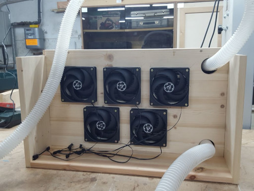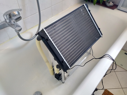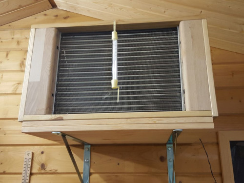 The summers in Germany are getting warmer every year. So, my father and I built a low power air conditioner for his summer house. The AC consists of a heat exchanger, a pump, and a water reservoir outside. The heat exchanger is made out of a car radiator and multiple CPU fans (Fig. 1a/b). The insulated water tank is located outside of the summer house and contains about 400 liters of cold water. During the day, the cold water is circulated through the heat exchanger cooling down the air inside the summer house. In the evening, the warmed up water is then used to water the plants. This dual use of the water correlates quite nicely. If the day was hot, the plants need more water and more of the water in the water tank has to be replaced by cold water. If the day was mild, less water is used. The power consumption of the whole setup is quite low. The fans require about 10 Watts of power, while the pump is rated at about 30 Watts.