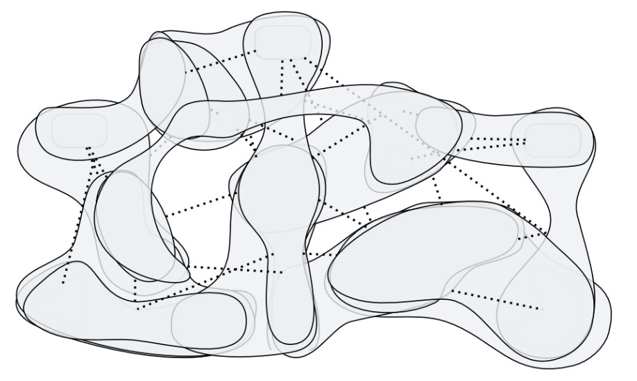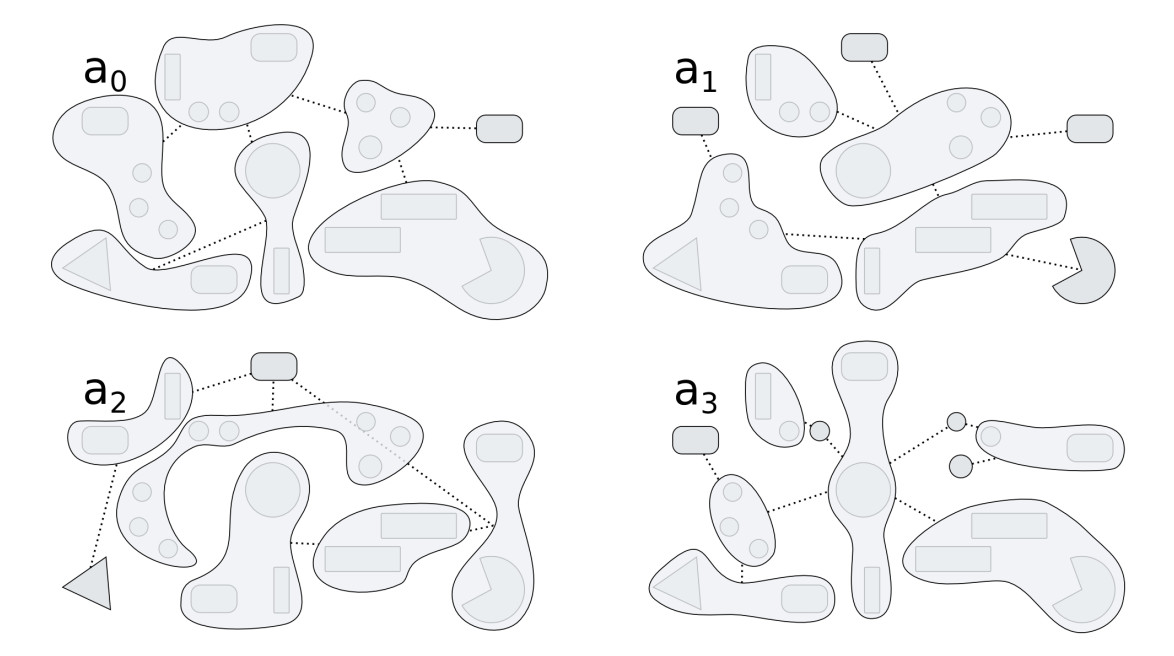 Furthermore, the intricate relations of higher- and lower-level categories attributed to a complex system affect the constituents of the corresponding model since the constituents are predominantly deduced from these categories. As a result, constituents of the model that reflect certain aspects of the complex system inherit some of the intricate relations from the underlying categories, i.e. they overlap to a certain extent where the underlying categories share common lower-level subcategories. Figure 2 illustrates this by showing the constituents of a hypothetical complex system with respect to four different aspects (Fig. 2a) and their resulting superposition when the constituents corresponding to the different aspects are merged into a single model of the complex system (Fig. 2b). The mutual influences of shared lower-level categories hint at potential side-effects between overlapping constituents that have to be considered in order to model the paricular complex system correctly.