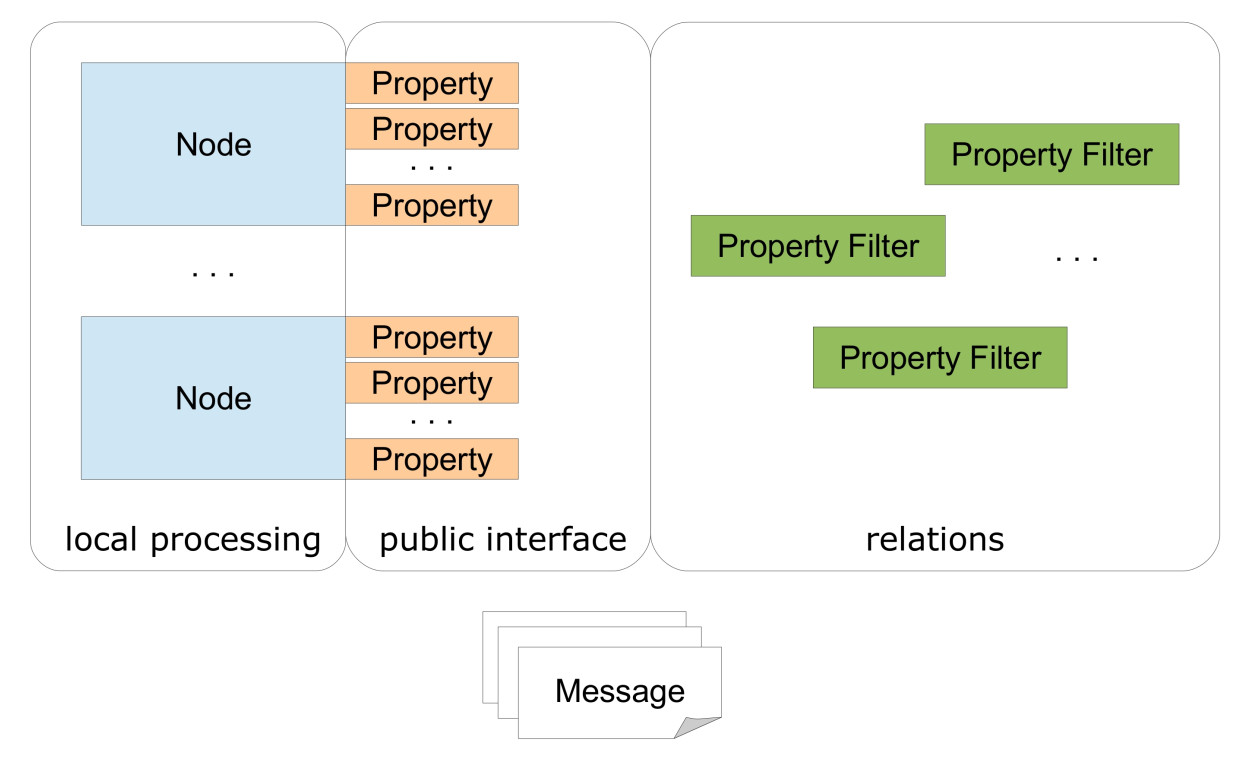 Figure 1 provides an overview on how these components relate to one another. The four component types Node, Property, PropertyFilter, and Message are the basic building blocks of the generalized model. The functional roles of the four components can be summarized as follows: