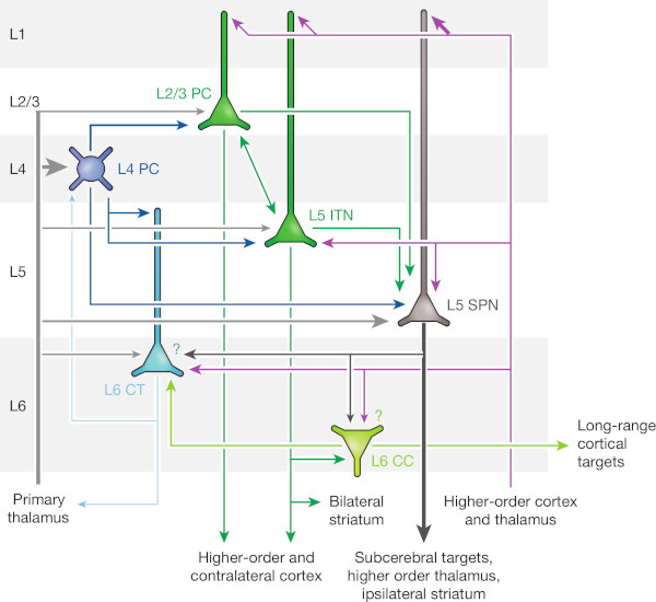 The other neuron groups shown in figure 1 can be interpreted as providing support for the AMC: The outputs of both L2/3 PC and L5 ITN connect locally to L5 SPN, which projects to subcerebral targets, e.g., motor centres, and non-locally to higher-order parts of the cortex. The output of the lower group L5 ITN makes an additional local connection to L6 CC, which projects to long-range cortical targets, but also locally to L6 CT, which in turn connects back to L4 PC and the primary thalamus. We propose that the described neural structure constitutes a single cortical minicolumn. At its core the minicolumn hosts a single autoassociative memory cell ( L2/3 PC / L5 ITN ) that is supported by neurons regulating its activity ( L4 PC ), its input ( L4 PC / L6 CT ) and its output ( L5 SPN / L6 CC ).
