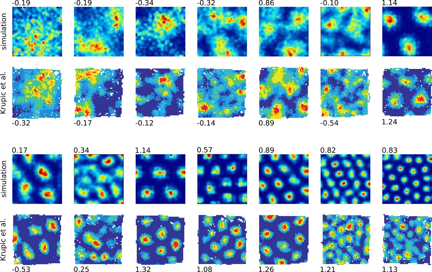 Figure 5 shows the result of some baseline experiments that qualitatively compare the firing rate maps of simulated and observed grid cells (observational data from Krupic et al. [25]). The RGNG-based grid cell model captures a wide range of characteristics that can be found in biological grid cells including “smeared out” firing fields. In the RGNG-based model these smeared out fields result from ongoing micro-adaptations of the dendritic prototype patterns during the integration window in which the firing rate maps were captured. It is plausible that a similar form of micro-adaptation might also occur within the observed, biological grid cells. Corresponding changes in the firing patterns were reported by Krupic et al. [25]).