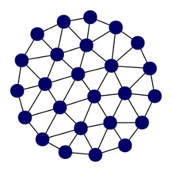 A group of neurons exhibiting a behavior that aligns with the aforementioned assumptions can be modeled by a (two layer) recursive growing neural gas (RGNG) [2]. A RGNG is a recursive variant of the growing neural gas introduced by Bernd Fritzke [19,20]. A growing neural gas (GNG) uses a data-driven growth process to approximate the topology of a given input space resulting in an induced Delaunay triangulation of that space. Figure 2 shows an example of a GNG network approximating a uniformly distributed, two-dimensional, circular input space. Each GNG unit marks the center of a convex polyhedron representing a local region of the input space. The relative size of this region is inversely proportional to the probability of an input originating from that region, i.e., the local density of the input space. In addition, the absolute size of each local region is determined by the overall number of GNG units that are available to cover the whole input space. The network structure of the GNG, which relates the respective local regions to one another, represents the input space topology.