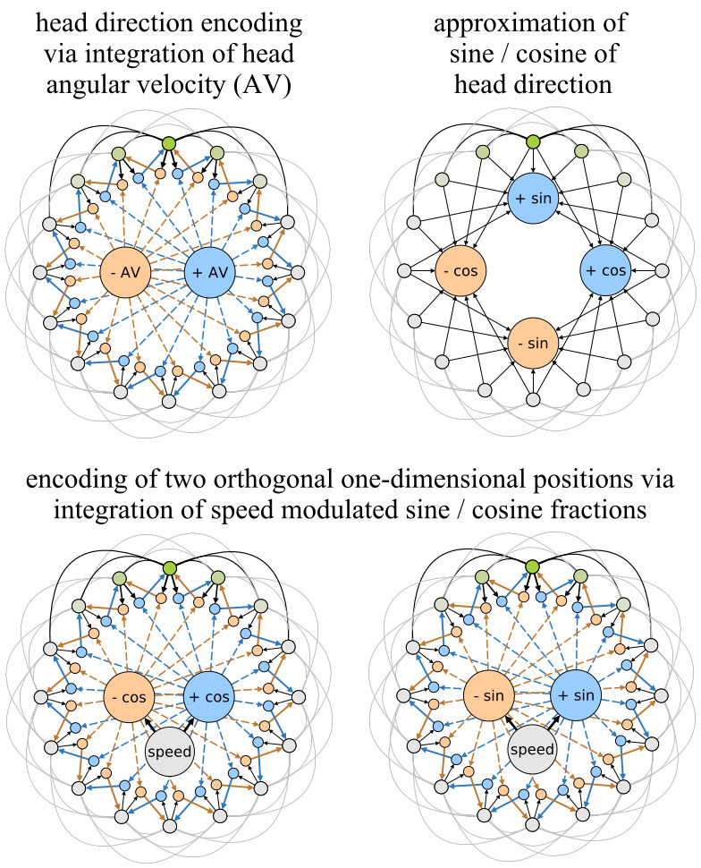 One possible neuronal circuitry that could produce input signals that originate from such a two-dimensional manifold can be derived from ideas by Mc-Naughton et al. [24]. They use one-dimensional attractor networks to explain how the activity of head-direction cells can result from neural integration of angular velocity signals coming from the vestibular system. Figure 4 (top-left) depicts such a model. The outer ring of units represents head-direction cells. They have excitatory connections to neighbouring cells that decline in strength with distance (outer black and grey lines). In addition the set of head-direction cells is subject to global feedback inhibition to constrain the overall neural activity. Typically, such a network forms a single “bump” of activity at one location (green colors). This bump can be moved by a set of hidden units (blue and yellow ochre) that are asymmetrically connected to the outer units. The hidden units receive excitatory inputs from the outer units and from an input unit, e.g., an angular velocity (+/- AV) signal. As a result the angular velocity signal is effectively integrated by the position of the outer bump of activity. In order to transform this head-direction signal into two orthogonal one-dimensional position signals the sine and cosine fractions of the particular head directions have to be approximated. This approximation can be achieved by utilizing a well-known electrotonic property of neurons. The more distant from the soma an axonal input to a dendritic tree is, the weaker is its total effect on the neuron’s activity [24]. Figure 4 (top-right) illustrates, how this property can be used to approximate the sine and cosine fractions of the current head direction. Using the sine and cosine fractions and modulating them with the current running speed of the animal, the same mechanism described for the integration of angular velocity signals can be used to generate two orthogonal, one-dimensional position signals (Fig. 4 bottom). The resulting high-dimensional input to the RGNG-based grid cell model will cause the modeled grid cells to exhibit their characteristic firing patterns as the underlying manifold is a two-dimensional, uniformly distributed, and periodic representation of space. It is important to note that the described input space signal is just one possible neuronal circuit of many.