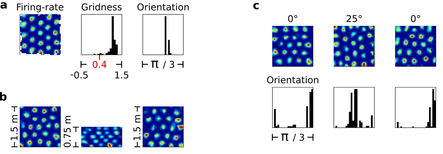 Lastly, figure 6c shows how the grid orientations in a group of grid cells can be anchored to an external landmark, replicating the corresponding phenomenon observed in biological grid cells. The left column shows the firing rate map of a single simulated grid cell and the distribution of grid orientations in the entire simulated grid cell group. The middle column shows the corresponding data after an imaginary, simulated landmark was rotated by 25°. The right column shows the data after the landmark was rotated back to its original position. In all three cases the resulting distributions of grid orientations resemble the distributions typically seen in observational data, while the grid patterns themselves remain stable.