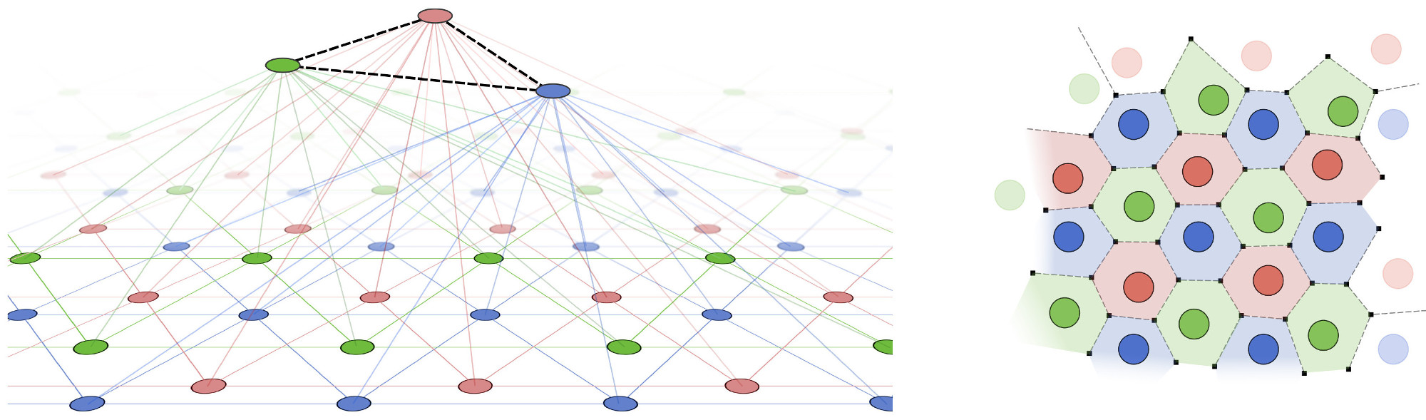 In the RGNG-based grid cell model each neuron performs an operation that is similar to that of a whole GNG, i.e., each neuron learns a prototype-based, dendritic representation of its entire input space. At the same time, each neuron is in competition with the other neurons of its neuron group. This group-level competition is necessary to account for the modular organization of grid cells in which neighboring grid cells share a common orientation, spacing, and field size and exhibit a uniform distribution of relative grid phases. Interestingly, both the learning of a prototype-based input space representation and the group-level competition can be described by the same dynamics. In the two-layer, RGNG-based grid cell model the top layer contains a set of connected units that each represent an individual grid cell. Associated with each top layer unit is a set of connected nodes in the bottom layer representing the set of input patterns that are recognized by the dendritic tree of the grid cell (Fig. 3 left). Applying a form of competitive hebbian learning within each set of bottom layer nodes (bottom layer competition) arranges the nodes in a triangular pattern that covers the entire input space. In addition, competition across the sets of bottom layer nodes (top layer competition) arranges the different triangular patterns in such a way that they share a common orientation and spacing. Furthermore, the top layer competition promotes the uniform spread of the individual triangular patterns across the input space (Fig. 3 right). As a result, the group of neurons described by this RGNG-based model forms a distributed, prototype-based representation of their input space. Each location in that space is represented by a unique pattern of neuronal group activity (ensemble activity) despite the fact that the activity of each neuron itself is ambiguous and self-similar to that of its peers.
