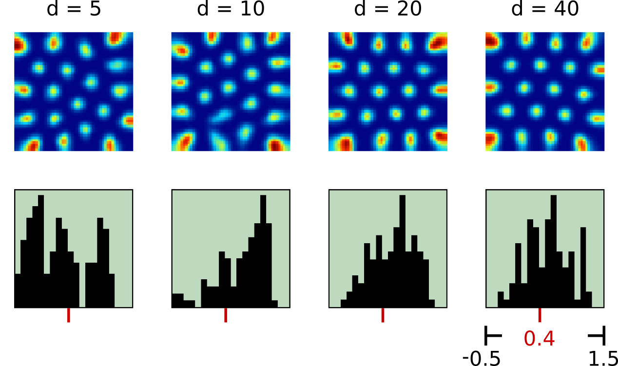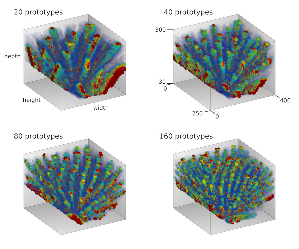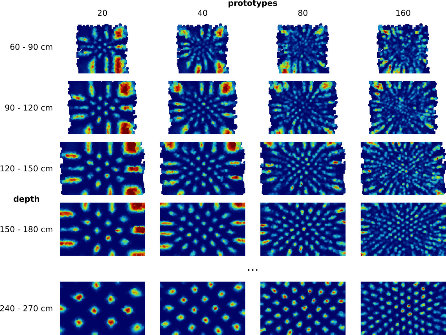 In a first set of experiments we simulated eye movements of one eye and fed the resulting motor signal into the RGNG model [4]. As expected, the model was able to discover the two-dimensional manifold of viewing directions in this input signal resulting in a grid-like distribution of firing fields (Fig. 3). Moreover, the results were relatively consistent across different sizes of motor neuron populations. However, the firing rate maps produced by the model looked significantly cleaner than the firing rate maps reported by Killian et al. [2] (Fig. 1b). This difference might just reflect the inherently difficult experimental conditions when working with primates instead of rodents. In that case, the observed firing rate maps would merely contain more measuring artefacts when compared to similar observations in rats or mice. Yet, the difference could also stem from a different or more elaborate input signal. To investigate this hypothesis we ran a second set of experiments where we simulated the movements of both eyes when fixating on given points in space [5]. As a result, we obtained three-dimensional, volumetric firing rate maps for each simulated neuron (Fig. 4a). The volumetric maps correlate the neuronal activity with points in a three-dimensional view box. We derived two dimensional firing rate maps by slicing through these volumetric maps at given depths (Fig. 4b). To our surprise, the apparent structure of these derived, two-dimensional firing rate maps appears to be more similar to the observed data by Killian et al. [2], especially when a depth range between 60cm and 120cm and a lower number of dendritic prototypes is considered. This depth range agrees with the distance between primate and computer monitor in the experiments of Killian et al. [ personal correspondence ].