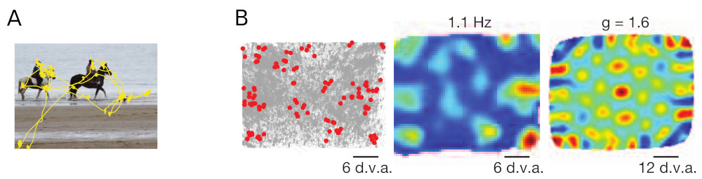 Killian et al. [2] were the first to report grid-like activity from entorhinal cells in an entirely different experimental setting. They investigated the activity of entorhinal cells in primates while the animals sat in front of a computer screen watching photographs. To precisely monitor where the animals were looking the viewing direction was recorded by an eye tracker (Fig. 1a). With this experimental setup Killian et al. found entorhinal cells whose activity correlated with the viewing direction of the animal. Moreover, the cells' firing fields in the animals visual space were arranged in a (coarse) hexagonal pattern (Fig. 1b). These results could not be explained by existing grid cell models as virtually all models were grounded in the prevailing navigation hypothesis using some form of continuous path integration at their core [3]. This continuous path integration could not be mapped on the fast, saccadic eye movements present in these experiments.