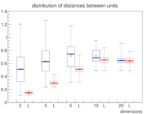 In a follow-up work [2] to our LISH approach [1] we investigated how the LISH approach performs in cases where the input space is high-dimensional. The analysis of high-dimensional data spaces is accompanied by a number of problems that are commonly referred to as the “curse of dimensionality” [4]. In this context a major problem is that the ability to discriminate data points by their relative distances diminishes with increasing dimensionality [5]. To observe the impact of different distance measures on the GNG and the local input space histograms we use the Minkowski distance in our analysis with varying values p for its exponent. By choosing the Minkowski distance a range of popular distance measures can be covered: for p = 1 it is equivalent to the Manhattan distance, for p = 2 it is equivalent to the Euclidian distance , and for p → ∞ it approaches the Chebyshev distance.