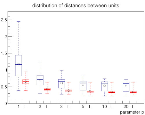In order to establish a baseline on how the appearance of the local input space histograms changes with respect to either a dense or a sparse input space and varying parameter p of the Minkowski distance a set of experiments using random input data was conducted. With increasing dimension n the GNG has to cover an exponentially growing volume of input space with a constant number of units. Similarly, the constant number of inputs is uniformly spread across this exponentially growing volume. As a consequence, the input space as represented by the constant number of input samples becomes increasingly sparse and the particular inputs to the GNG approach an equidistant position between their respective first and second closest units. Likewise, the distances between the GNG units themselves become more and more similar and the locality given by the GNG edges gets essentially lost as the distributions of pairwise distances between all units and the distributions of pairwise distances between connected units converge (Fig 3b). This dynamic is reflected in the shape of the local input space histograms (Fig 3a). Based on these results we tested the influence of the choosen distance measure in two scenarios with a dense and a sparse input space, respectively. The increase of parameter p leads in either scenario to a compression of distances between the GNG units similar to the effect caused by an increase of input space dimension (Fig. 3d, dense scenario shown; for sparse scenario see supplementary material). However, in case of a dense input space the locality given by the GNG edges stays intact with increasing values of p, i.e., the pairwise distances of connected units differ clearly from the pairwise distances between all units. The median value of all pairwise distances between the units gets pushed towards the upper quartile while the bulk of all pairwise distances between connected units stays below the lower quartile of distances between all units. This behavior can be explained by the fact that with increasing values of p differences between vectors that are only distributed across few vector components are emphasized whereas differences that are spread across many vector components are deemphasized. Thus, despite the absolute compression of distance values, the relative contrast between near and far distances of inputs that share a common closest unit actually improves with increasing values of p. The appearance of the local input space histograms is virtually unaffected by the described changes in the distance distributions as the distance ratio on which the histograms are based depends only on the relative distances between an input vector and its respective first and second closest units.