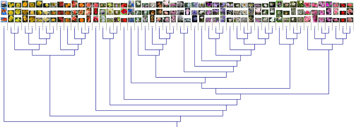 Analogous to the force-based graph drawing we tested the semantic meaningfulness of this approach by mapping the images whose color histograms were closest to the prototypes of the GNG onto the hierarchical clustering dendrogram of a GNG. The mapping shown in figure 6 illustrates, that in this case too the local input space histograms provide usefull information about the structure of the input space.