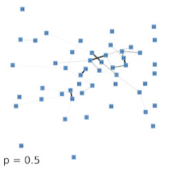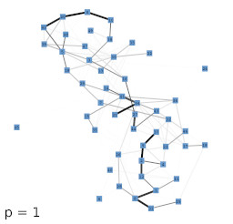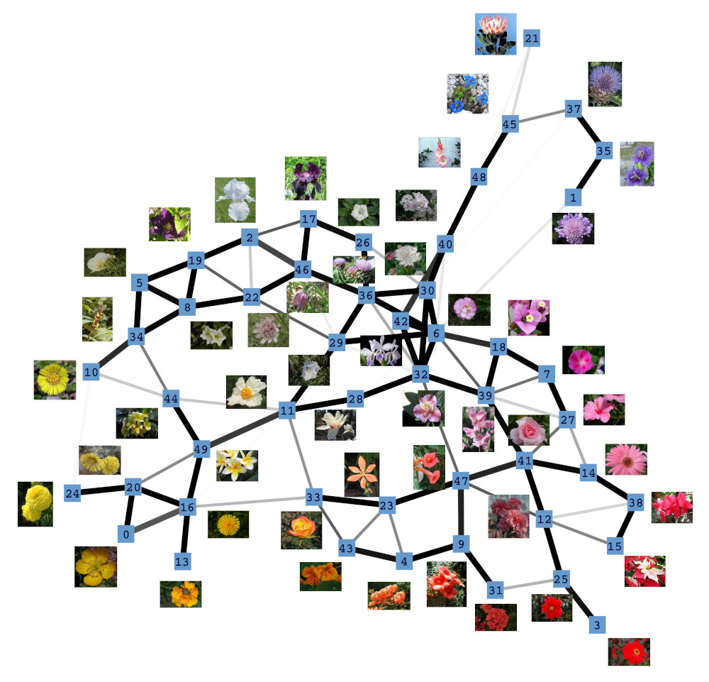 Next, we investigated the behavior of the LISH approach for high-dimensional data that contains a known, low-dimensional manifold. As test-data we chose 64-dimensional color histograms of images from a flower database. To visualize the results, we used a force-based graph drawing algorithm that used information derived from the LISHs to weigh the connections between the GNG units. The resulting graph drawings for GNGs with 50 units that received 64-dimensional color histogram input are shown in figure 4b-f. For comparison, figure 4a shows the result of the unmodified drawing algorithm. The drawings seem to support the previous observations that with increasing value of p the locality among neighboring units appears to increase as more and more units get connected by strong edges, i.e., edges that cover dense regions of the input space. To examine if the resulting structures are also semantically meaningful we mapped the images whose color histograms were closest to the prototypes of the GNG onto the graph drawing shown in figure 4f. The mapping shown in figure 5 demonstrates, that the strong edges selected on the basis of their local input space histograms indeed represent meaningful neighborhood relations.