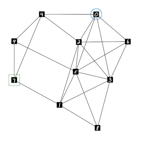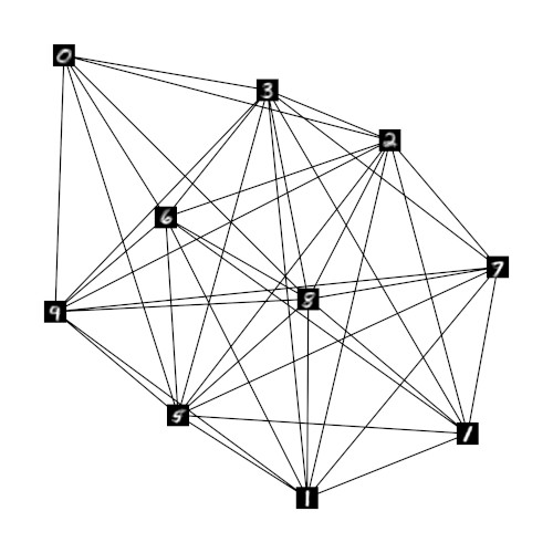 To show that the relaxed one-hot encoding can retain meaningful information on the relation of units in GNG h if the number of units in GNG r decreases we ran experiments with networks of size 30, 20, and 10. Figures 2a-c show these networks and their structure. As in figure 1b the shown prototypes originate from the underlying GNG h and are chosen according to the highest entry in the respective prototype vector of GNG r. The resulting network structures indicate that meaningful neighborhood relations can indeed be retained by the respective prototypes of the GNGs r . Even in the case of GNG r10 with only 10 units (fig. 2c) the average degree of the units remains low and the shown prototypes of neighboring units exhibit plausible similarities. In contrast, if the MNIST input space is processed directly by a GNG with only 10 units, the average degree per unit is significantly higher such that almost every unit has every other unit as direct neighbor (fig. 2d).