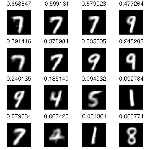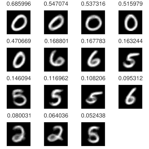 To provide a more detailed look at the composition of prototype vectors in GNG r10 figure 3 shows all vector entries with a value above 0.05 for two prototype vectors of r10, which are marked by a blue circle and a green square in figure 2c. In addition to their numerical value the shown entries are supplemented with renderings of the corresponding prototypes from the underlying GNG h. The entries are sorted left-to-right and top-to-bottom by value in descending order. The degree of similarity between the prototype associated with the highest value (top-left) and the remaining prototypes appears to correspond well to the numerical differences between the respective values. Furthermore, the number of prototype entries of substantial size is small compared to the overall number of entries (50), i.e., although the prototype vectors of GNG r10 refer to larger local regions in the underlying MNIST input space they remain sparse.