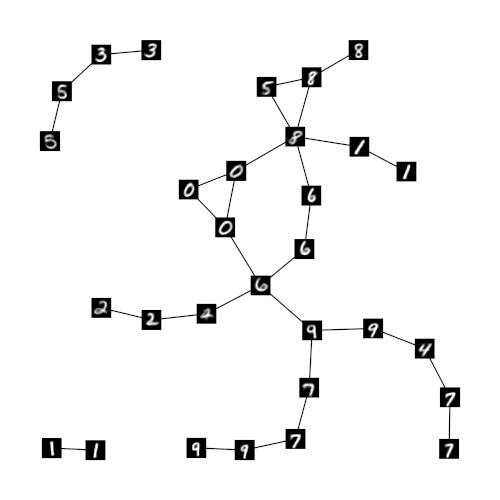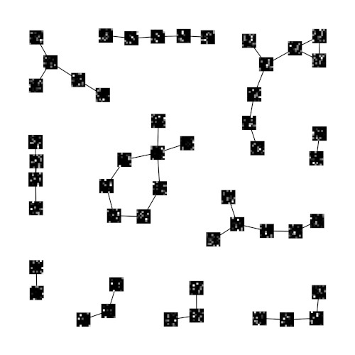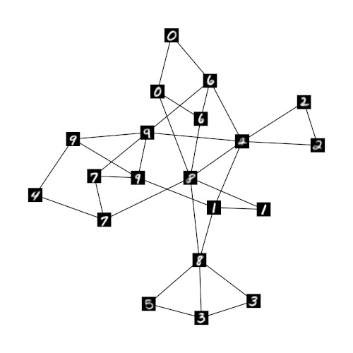 To investigate the proposed encoding we trained a GNG h with samples from the MNIST database and fed the output of h into a second GNG r using the relaxed one-hot encoding described above. Figure 1 shows the resulting structure of GNG r when both h and r have 50 GNG units. Subfigure 1a renders the prototypes of r as bitmaps with high values represented by light colors and low values represented by dark colors. The shown prototypes reveal the sparse patterns that result from the relaxed one-hot encoded input. As expected, neighboring units clearly exhibit similar sparse patterns corresponding to neighboring local regions in the original MNIST input space. To illustrate the latter relation figure 1b shows prototypes of GNG h superimposed on the network of GNG r. Each prototype was chosen according to the highest entry in the prototype vector of the respective unit in r. The overlay substantiates that neighboring units in the second GNG r do indeed refer to neighboring regions in the original MNIST input space of the underlying GNG h. Since both GNGs h and r have the same number of units, the second GNG r can allocate a single unit for each possible input pattern originating from h. As a consequence, the edges in r form mostly chains of units that refer pairwise to the most similar units in h with regard to the LISH average bin error between these units.