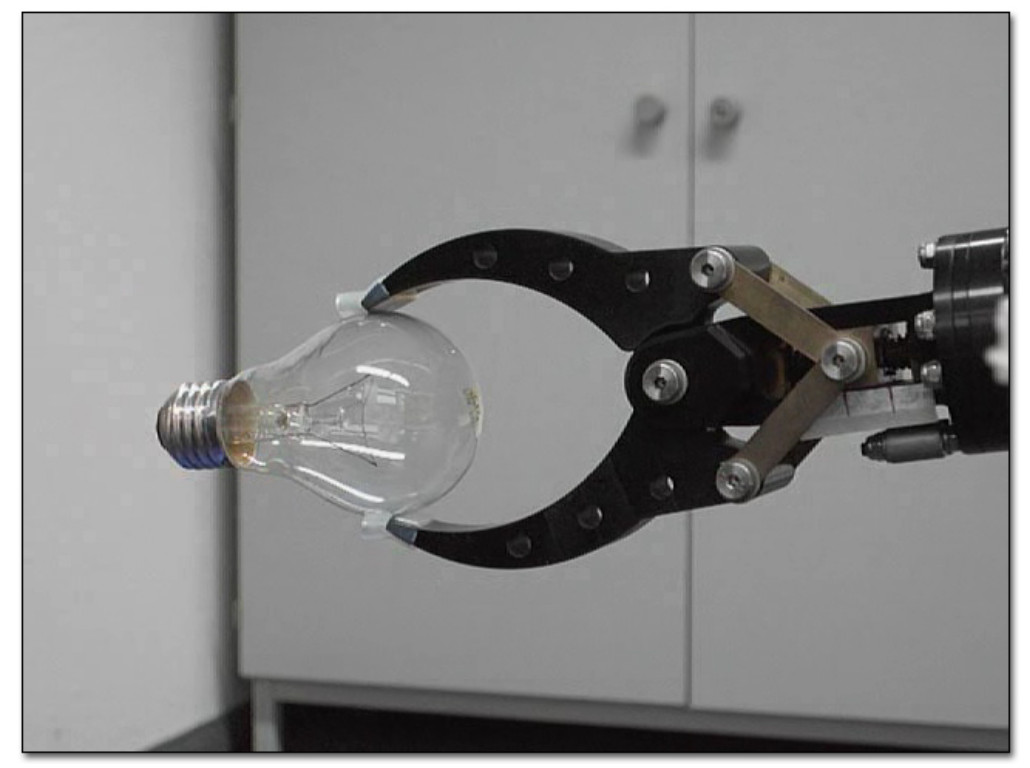 The back EMF signal measured has relatively low noise, which allows the speed to be controlled very precisely. This holds true even for very low speeds. In our experiments the skid of the spindle drive could be moved as slow as 1.5mm per second. This speed control enables the dc-manipulator to carry out very precise manipulation tasks which were not possible before to such an extent. Furthermore, with the information of the actual speed and the actual PWM duty cycle of a joint it can be estimated if the joint is in some way obstructed. Such an estimation is especially important for the gripper, as it enables the system to grasp very fragile things without damaging them. In addition, this information can be used to inform the operator of the manipulator of a possible degradation of a joint, e.g. caused by some fouling on the spindle or motor shaft. Thus protecting the manipulator system at an early stage and reducing the risk of a complete breakdown of that particular joint. As an example for the sensitiveness of this back EMF based force control we were able to grip, among other sensitive objects, a lightbulb with our system (fig. 1c).