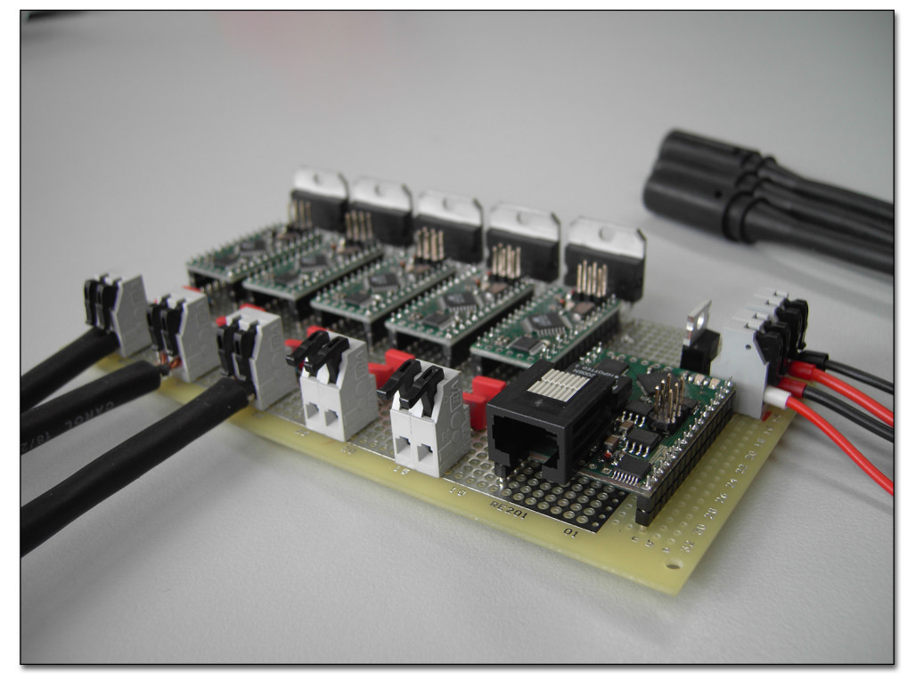 The electronics used to demonstrate the back EMF control approach is shown in figure 1b. The prototype board supports the back EMF control of up to 5 dc-motors. For each motor a separate microcontroller unit reads the back EMF voltage and generates the PWM signal send to the motor driver IC. The used microcontroller on each unit is an ATMEGA168 by Atmel and the motor driver IC is a L6203 by STMicroelectronics. These joint control modules are connected via an I2C bus to a central microcontroller module with ethernet capabilities as communication interface.