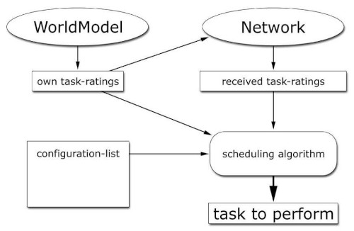 My main contribution was the development of a decentral scheduling algorithm that allows multiple robots to coordinate their behavior to achieve a common goal in a challenging, dynamic environment where communication might be intermittent and the number of robots might change without prior notice [2,3]. The behavior of the robots is described by a set of tasks that each robot can perform and a set of task configurations that describe which tasks can or should occur simultaneously. Each robot continously evaluates how well it can execute each of the tasks according to its current state. For example, a task might be move_to(x,y). If the robot is already close to position (x,y) it rates the task with a high value. If the robot is unable to reach position (x,y) it will assign a value of 0 to this task. Once a robot has rated all tasks, it broadcasts these ratings to the other robots, e.g., with a single UDP broadcast packet. All robots that receive this broadcast will update an internal table that holds the task ratings of all robots and use this table as the most up-to-date estimate how well each robot of the robot team can execute each possible task. The scheduling algorithm can now calculate a score for every task configuration permutation. The task configuration that has the highest score is then used to decide, which robot is assigned which task. As this decision is deterministic, no further coordination between the robots is needed.