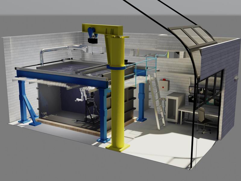 Designing and setting up our underwater test lab was a significant part of the C-Manipulator project [1]. To explore computer-assisted manipulation in deep sea environments we aimed at reproducing an controlling a number of key variables including lighting conditions, turbidity of the water, and movements of the manipulator base. To control the lighting conditions we opted for a black tank and sealed the water surface with multiple layers of black hollow spheres, which are commonly used to limit evaporation and reduce the presence of birdlife on water reservoirs. To control the turbidity we installed turbidity sensors, a powerful filtration system, and chose a reasonable tank size of 25m³ to allow for a quick turnaround time. We tested various means to increase the turbidity of the water in a controlled fashion, e.g., by dissolving precise amounts of clay, lime, or certain pigments. In order to control the movements of the manipulator base, e.g., to simulate the movements of an ROV, we installed a 3D gantry crane above the tank that facilitated precise and repeatable movement. Besides these main elements we installed additional support infrastructure like a pillar slewing crane to lift test articles in and out of the tank as well as an external hydraulic system to power the hydraulic underwater manipulator while keeping the noise levels inside the lab on a tolerable level.