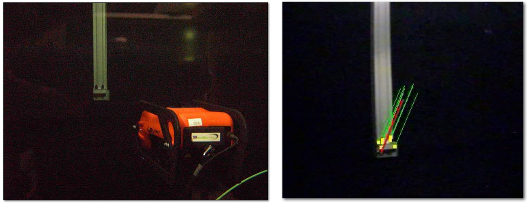 We tested the system in our underwater testbed. The testbed consists of a 25m³ tank spanned by a 3D gantry crane. The gantry crane allows an object to be precisely moved in all 3 dimensions inside the tank with speeds up to 5 meters per second. To test the hover control, the LBV is positioned manually in front of the tip of the gantry crane. As the tip is now in the center of the video image, the features which are selected after the activation of the hover control, usually belong to the tip of the gantry crane. In this situation, the ROV is locked onto the tip of the crane (Fig. 1b). As long as the hover control is activated, the ROV will follow the movements of the gantry crane. Despite the low control frequency the system was able to keep its relative position surprisingly well for periods of up to 30+ minutes.