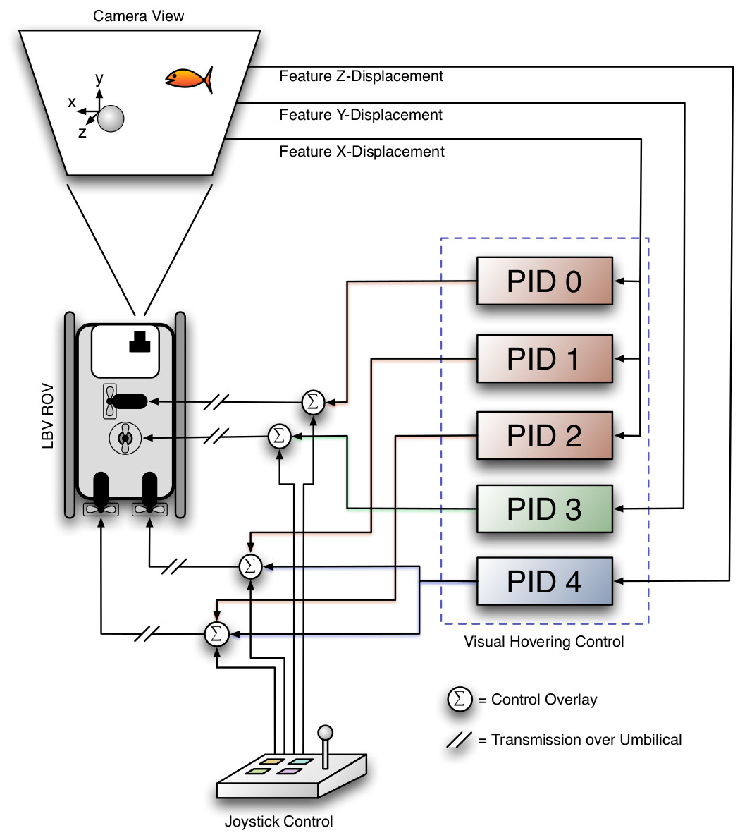 We tested our approach using the small-class LBV150 ROV by Seabotix. The vehicle is normally controlled by a hand controller which is connected to the surface power supply. The hand controller uses a RS232 signal to communicate with the ROV. The signal is modulated onto the DC power inside the surface power supply and is demodulated onboard the ROV. In order to be able to control the vehicle with a computer, the protocol sent by the hand controller was reimplemented such that the computer could completely replace the manual control. As the hand controller has only a control frequency of just 2Hz, the computer is also bound to this rather slow control frequency. In our setup, the ROV is controlled via a software running on a standard desktop computer or notebook. The software displays information of the actual system state, e.g. the actual thrust on the different thrusters, and has an integrated video window which displays the video feed of the ROV. The hover control can be activated/deactivated at any time with the respective button on a joystick. When the hover control is activated, the system selects a number of salient features around the center of the actual video frame using our vision-based algorithm. Subsequently this set of features is tracked by the Lucas-Kanade optical flow until the hover control is deactivated again. While the hover control is activated, the response of the ROV to the relative movements detected by the vision system can be specified due to five PID controllers (Fig. 1a). The PID controllers are highly parameterized to be adaptable to different vehicle and thruster types. For example, the forward thrusters on the LBV have a preferential direction and thus the output of the correspondent PID controllers is asymmetric.